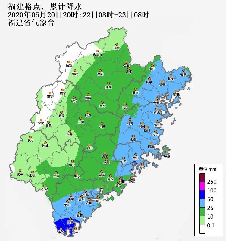 22日白天,全市中到大雨,福州市區南部、永泰東部、閩侯南部、福清和長樂的局部鄉鎮有暴雨;