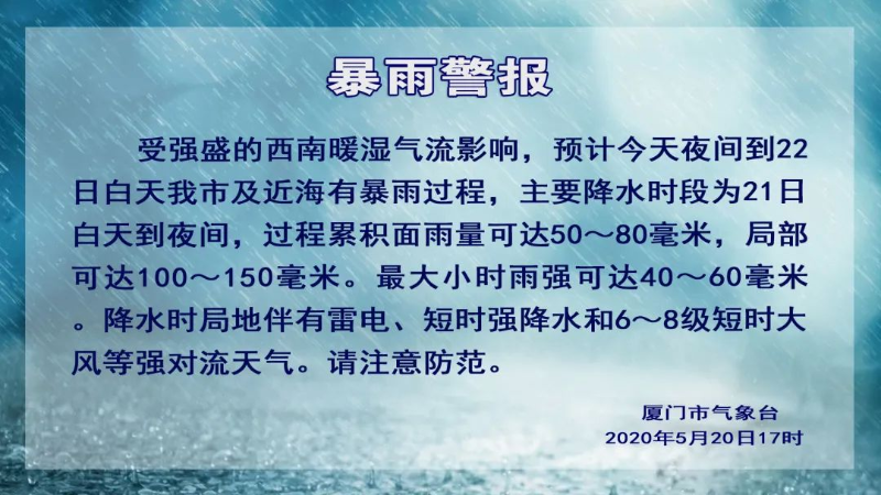 根據廈門市氣象局暴雨預警,預計從今天夜間起至22日白天,廈門市及沿海有暴雨過程。這次降雨也是入汛以來首場強降雨過程,主要降水時段集中在21日白天到夜間,過程累積面雨量可達50毫米-80毫米,局部可達100毫米-150毫米,最大小時雨強可達40毫米-60毫米。降水時局地伴有雷電、短時強降水和6-8級短時大風等強對流天氣。