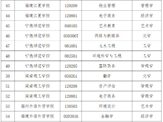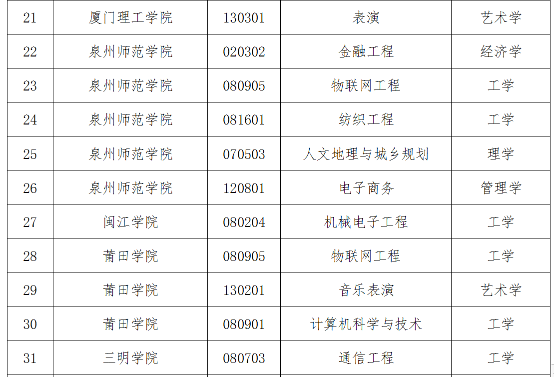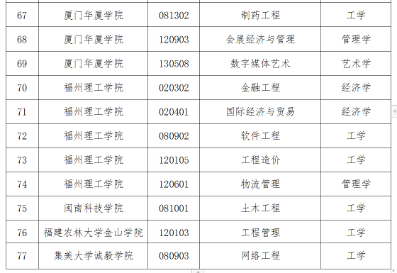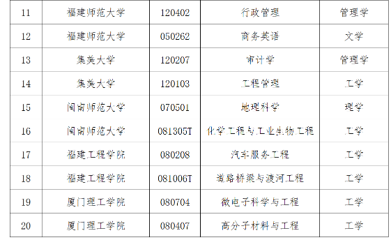 根據(jù)福建省學位委員會、福建省教育廳《關于調(diào)整學士學位授權專業(yè)增列審核工作的通知》(閩學位〔2015〕4號)和《關于2016年高等院校增列學士學位授予單位和授權專業(yè)審核工作有關事項的通知》(閩學位辦〔2016〕9號)精神,在院校自行審核申報基礎上,省學位辦根據(jù)有關文件精神進行了認真復核,經(jīng)研究,同意廈門大學等26所院校的西班牙語等77個本科專業(yè)增列為學士學位授權專業(yè)。現(xiàn)予以公布。