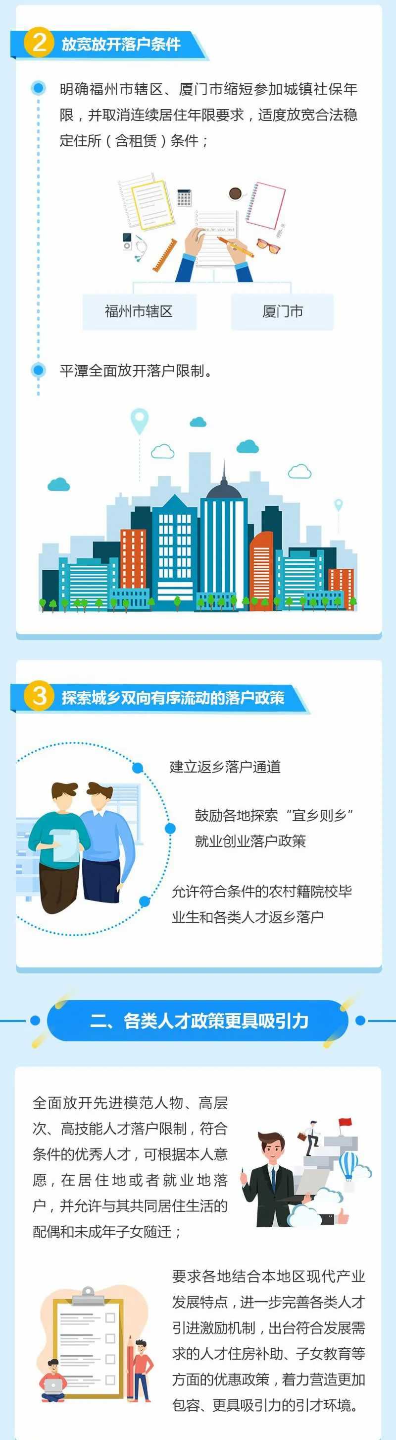 福州市轄區、廈門市縮短參加城鎮社保年限,取消連續居住年限要求,在原有政策規定基礎上,適度放寬合法穩定住所(含租賃)規定條件。其中,福州市轄區對參加城鎮社保年限要求不超過2年;廈門市區分島內、島外制定梯次化落戶政策,對參加城鎮社保年限要求不超過3年,放寬放開共同居住生活的配偶、未成年子女隨遷落戶。平潭綜合實驗區以合法穩定職業、合法穩定住所(含租賃)為依據,全面放開落戶限制。
