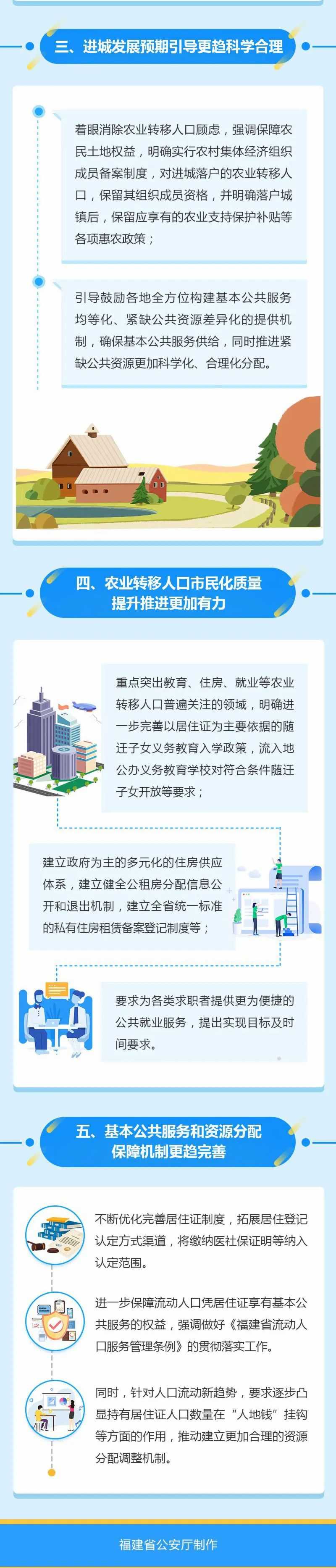 開辟租賃經住建部門租賃備案登記的私有住房落戶政策通道,在縣(市)城區以外的建制鎮租賃私有住房且穩定就業創業半年以上的農業轉移人口,可以在就業創業地公共地址上落戶,房屋所有人同意的,也可以在租賃住房落戶。各市、縣(區)和平潭綜合實驗區結合城市綜合承載能力,穩妥推進在城區租賃經住建部門租賃備案登記的私有住房落戶政策,優先解決進城就業創業時間長、能力強且穩定長期居住在租賃住房的農業轉移人口落戶問題;促進“宜鄉則鄉”就業創業,支持鼓勵已完成農村權益確權的地方,探索實施農村籍院校畢業生和各類人才返鄉就業創業的落戶政策。