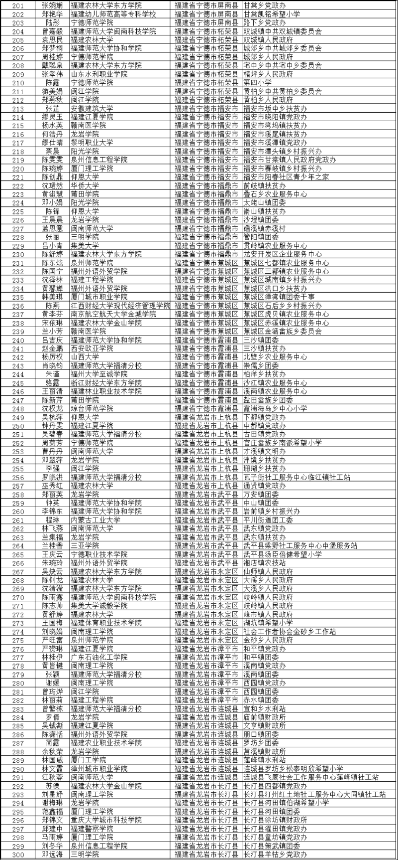 東南網7月15日訊 15日,福建省畢業生就業創業公共服務網發布名單公示。根據《2020年福建省大學生志愿服務欠發達地區計劃實施方案》(閩大學生志愿辦〔2020〕4號)相關規定,經過各高校、各地市審核、評分、體檢等環節,并經省“欠發達地區計劃領導小組”同意,最終錄選300名2020屆大學生志愿者參加欠發達地區計劃。