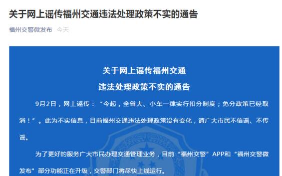 9月2日,福州交警微發布推送文章《關于網上謠傳福州交通違法處理政策不實的通告》對網傳消息進行辟謠。文章指出:此為不實信息,目前福州交通違法處理政策沒有變化,請廣大市民不信謠、不傳謠。為了更好的服務廣大市民辦理交通管理業務,目前“福州交警”APP和“福州交警微發布”部分功能正在升級,交警部門將盡快上線運行。