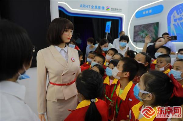 第三屆數(shù)字中國建設峰會期間,東南網(wǎng)策劃并進行網(wǎng)絡視頻直播,聚焦展示成果展上亮相的“黑科技”、新成果。圖為AI機器人與小朋友互動。