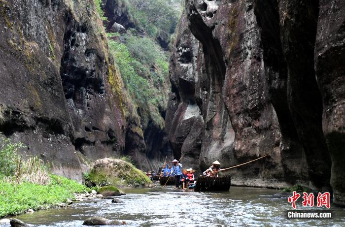 游客乘坐竹排在上清溪景區游玩。記者 呂明 攝