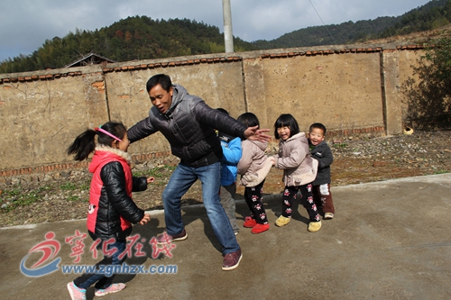 "要抓緊我啊,快跟上,不要給老鷹吃掉了!"在教室樓下的院子里,楊老師正和孩子們玩"老鷹抓小雞"的游戲,5歲的楊穎小朋友扮演老鷹,楊老師扮演母雞,身后的4只"小雞"正一個扯著一個的衣服,嘻嘻樂樂地扭來扭去,3歲的潘永濤小朋友排在最后,笑容燦爛得像朵花。
