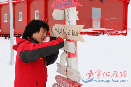 這些天,在南極長城站,來自廈門廈工機械股份有限公司的一位機械師把一塊家鄉方向牌釘在木樁上。