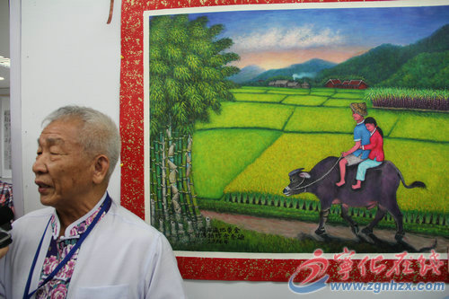 ? ? “這次征集書畫,我很重視,幾易其稿。我的畫要永遠留在寧化,讓客家鄉親進一步了解臺灣的風土人情,加深海峽兩岸人民的感情?!?0月14日,寧化“祖地情?中國夢”海峽兩岸客家書畫展現場,油畫《兩岸遍地黃金》的作者余秀雄一現身,就被眾多媒體記者團團圍住接受采訪。