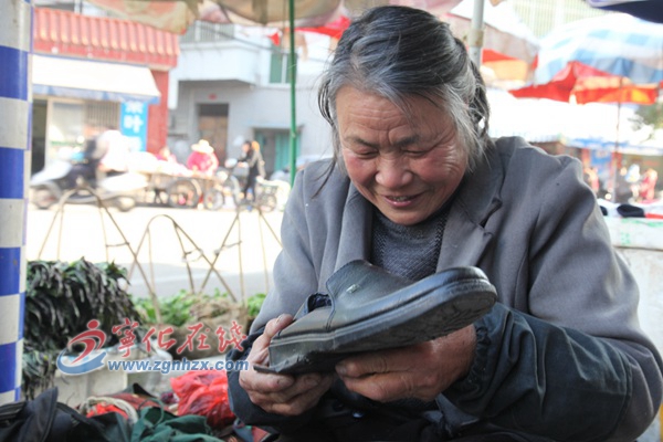 修鞋是個技術活,釘、修、補、換、縫、接、粘、改等技術,樣樣都要掌握得相當嫻熟。筆者初見陳碧蓮時,她正低著頭修鞋,臉上的表情很專注,腿上鋪著一塊圍布,左手拿著鞋子,右手靈活地在鞋子上穿針引線。不一會兒,鞋子就上完線了,用剪刀小心地剪去多余的線頭,然后仔細檢查鞋子一番,再在上線處加一層膠水,確定沒有問題后,才把鞋子遞給顧客。她說,加多一層膠水是為了讓鞋子不進水,更耐穿,女鞋上線一般要上30針左右,男鞋一般40針左右。“別看這活兒不起眼,要想干長久,一定要保證質量,這樣人家才會經常找你修鞋。特別是冬天,天氣太冷,膠皮不好往鞋跟上粘,我就帶回家里加溫,這樣才能粘牢。”陳碧蓮一臉認真。