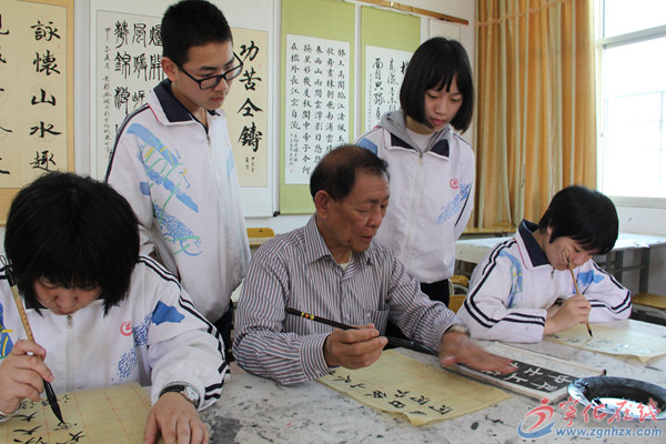 “毛筆的握法,落筆時(shí)要一筆一劃,方正平直……”4月25日,寧化縣城東中學(xué)外聘書法教師陳建智,像往常一樣,早早地來到學(xué)校書法室,免費(fèi)教學(xué)生練習(xí)書法。