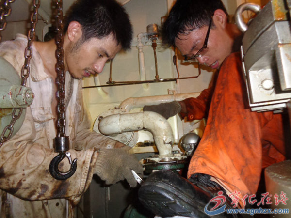 孫金鹿(左一)帶領(lǐng)機工在泵艙搶修洗艙泵