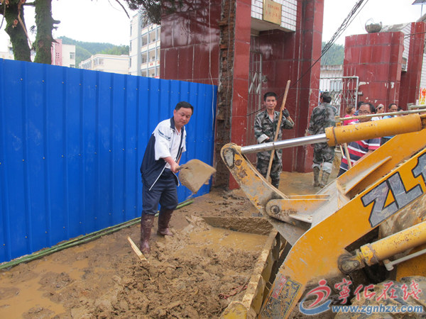 ??? 俞顯金站在食堂門口的走道拐彎處,也就是上樓的道口,這里水流特別急。他站在湍急的洪流中,一手扶墻,一手接引那些沿人墻走過來的學(xué)生,幫助他們向門口慢慢地挪過來。一個,二個,三個……他一邊安撫學(xué)生,一邊拉著學(xué)生的手,幫助他們向樓上撤離。洪流卷來的大樹,在他面前漂過,險些把他撞倒,他好幾次站立不穩(wěn),幾乎要被洪水沖走,但他始終咬著牙關(guān)堅持著,直到學(xué)生全部撤離到安全地帶,才松了一口氣,累得癱坐在樓梯上。