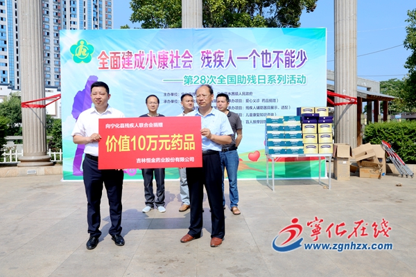 ? ? 活動現場,吉林恒金藥業股份有限公司向寧化殘聯捐贈價值10萬元的藥物,助力殘疾人康復治療。吉林恒金藥業股份有限公司組織員工到場開展愛心義診,為過往市民特別是殘疾人測量血壓、檢測疾病,深受大家歡迎。
