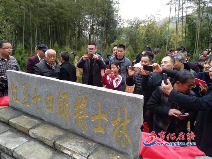 先烈后人在紅三十四師將士林紀念碑前拍照留念。
