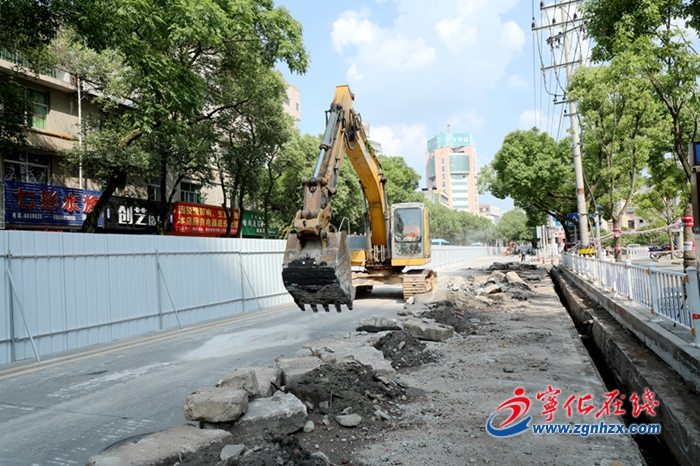 5月19日,在寧化縣城區(qū)南大街“白改黑”項目施工現(xiàn)場,挖掘機、切割機正不停運轉(zhuǎn),工人們正進行道路病害處理、水溝蓋板置換等作業(yè)。