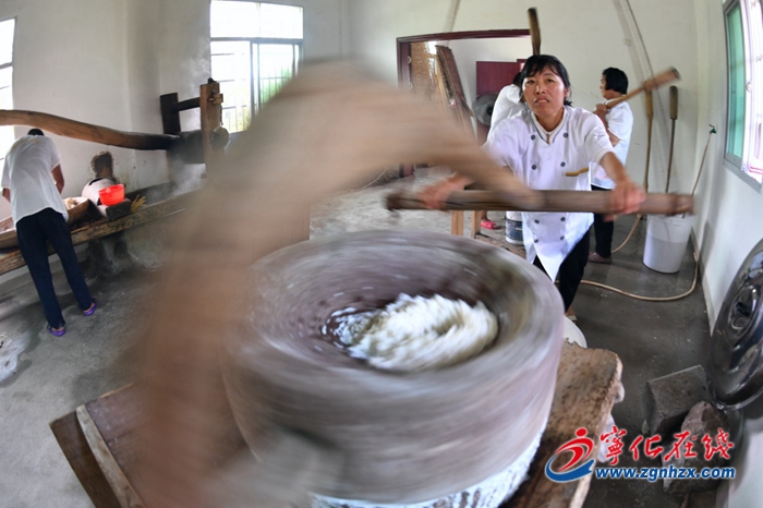 把米洗凈并浸泡山泉水8~10小時后,用石磨磨成米漿。