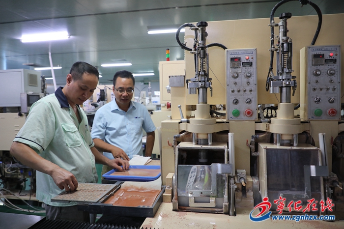 總經理吳小春(右)與工人進行業務交流