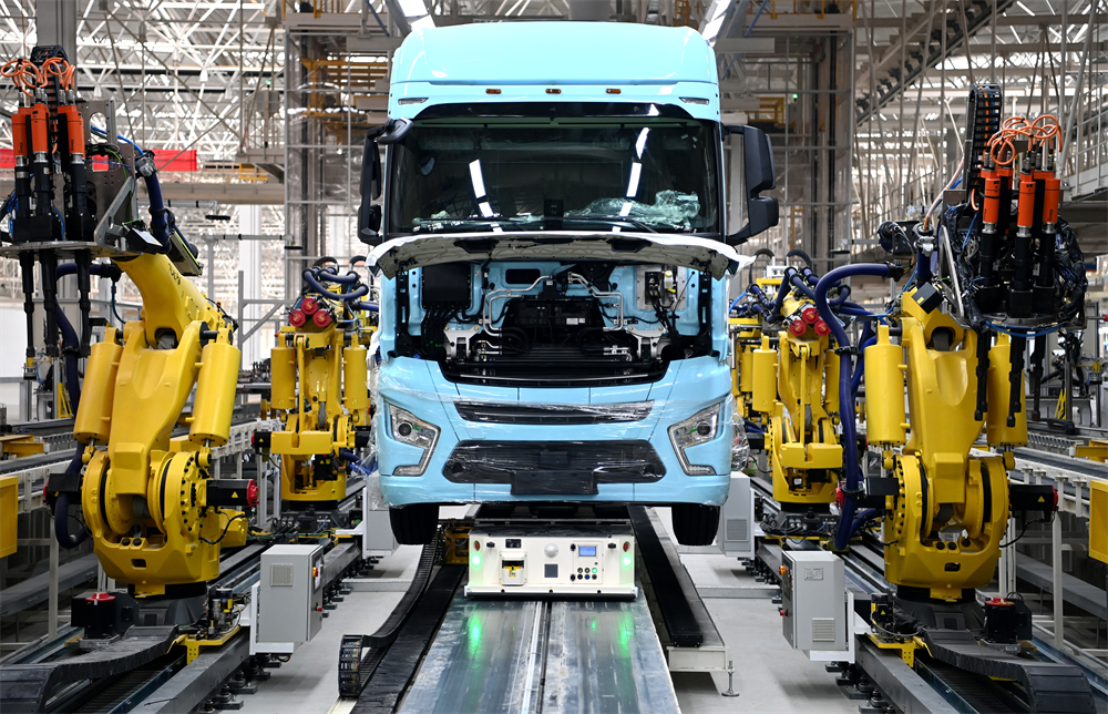 △ 一輛重卡在汽車總裝生產線輪胎自動化裝配擰緊無人工作站進行裝配。