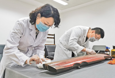 遼寧省博物館工作人員在對九霄環佩琴進行保養。九霄環佩琴制作于唐代。在古琴琴底,鐫刻著“九霄環佩”四個字。琴面上,鑲嵌著13個由蚌殼制成的圓點,起到標記琴弦音位的作用。