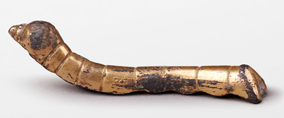 鎏金銅蠶。1984年出土于陜西安康石泉縣,體態為蠶仰頭或吐絲狀,制作精致,造型逼真,見證了開辟絲綢之路的歷史。