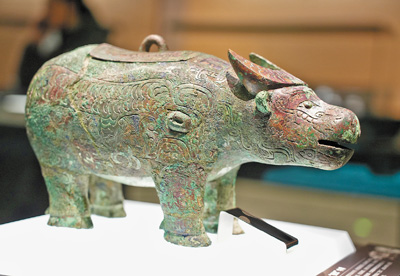 河南安陽殷墟博物館內展出的亞長牛尊,是目前殷墟發現的唯一一件牛形青銅尊。
