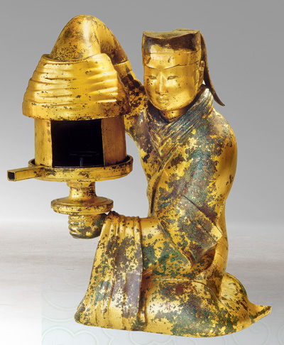 長信宮燈。1968年出土于河北保定滿城漢墓,形狀為跪地執燈的宮女,通體鎏金。燈盤可轉動,以調節燈光亮度和照射方向,燈身人物中空的衣袖和身體作為通道用于排煙。