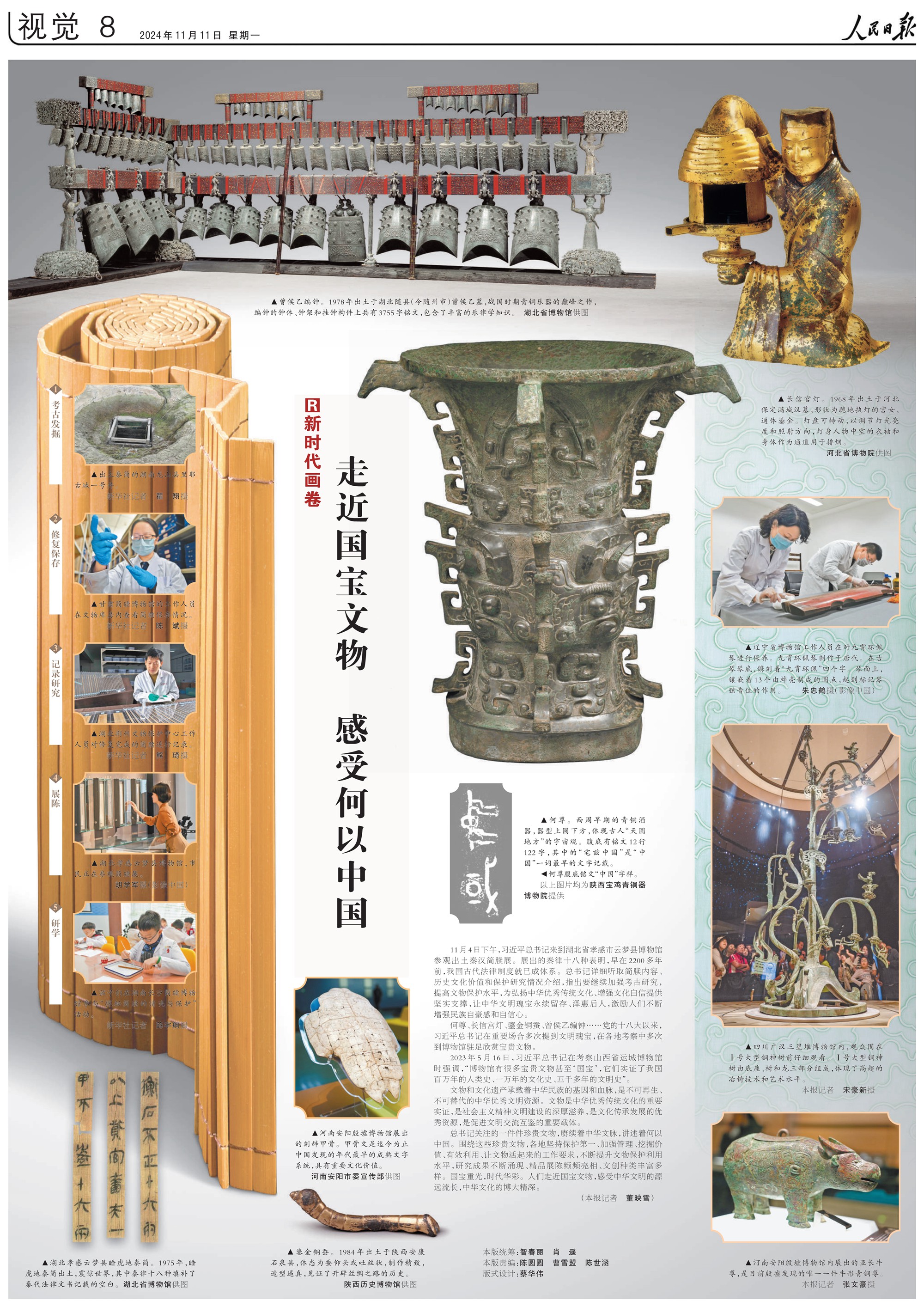 總書記關注的一件件珍貴文物,賡續著中華文脈,講述著何以中國。圍繞這些珍貴文物,各地堅持保護第一、加強管理、挖掘價值、有效利用、讓文物活起來的工作要求,不斷提升文物保護利用水平,研究成果不斷涌現、精品展陳頻頻亮相、文創種類豐富多樣。國寶重光,時代華彩。人們走近國寶文物,感受中華文明的源遠流長,中華文化的博大精深。