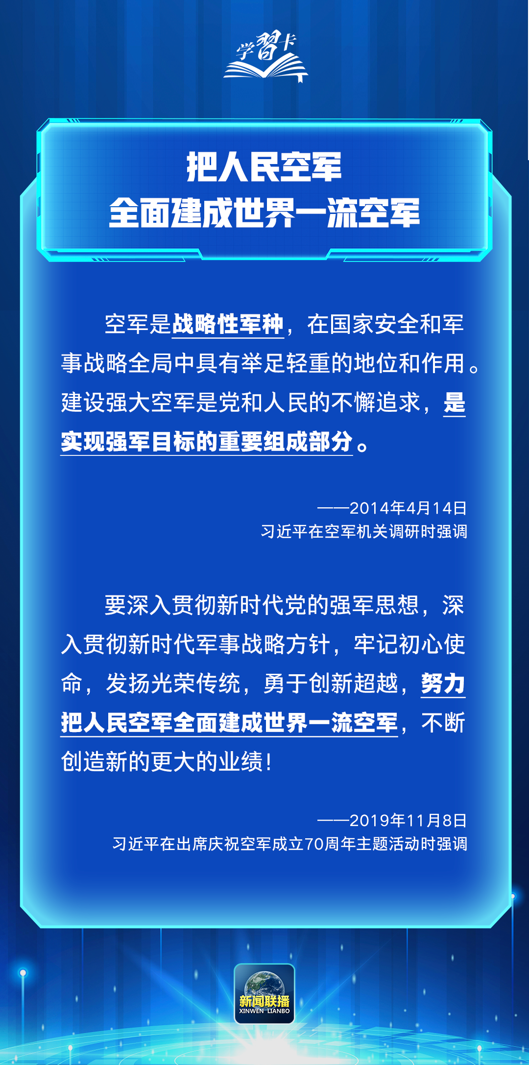 2024年11月11日,是中國人民解放軍空軍成立75周年紀念日。在黨的堅強領導下,一代代空軍官兵胸懷凌云壯志,搏擊萬里長空,推動空軍建設取得舉世矚目的成就,為維護國家主權、安全、發展利益建立了不朽功勛。如何把人民空軍全面建成世界一流空軍?一起學習↓