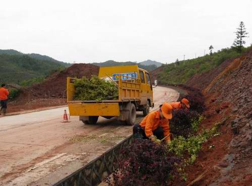 從3月中旬開始,“省界碑行動”拉開序幕,寧化分局組織肩頭嶺、丁坑口、羅坊壩等站班工人,同時配備挖掘機、鏟車兩臺、運輸車等,實行人機同步作業。在做好綠化場地平整、水溝墻加高、完成水溝墻墻背填土和省界五里亭特殊景點征地、場地置輪土回填的前提下,按“沿線不露土、不露石、三季有花、四季常青”的目標要求,采取喬灌木、花草相間及喬木和路基之間種植紅葉石楠綠籬等方式,組織力量在省界公路兩旁挖穴、種植喬灌木、花草、地被。截止