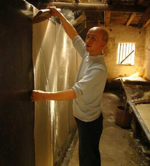 最后,把紙送入焙烤房烘干。因為溫度高,焙紙師傅都光著膀子干活。焙紙工用刷子把墻刷濕,分開濕紙,按順序一張張貼在焙壁上,當他回到第一張紙前,濕紙正好蒸去水分,變成干紙,一張張揭下。如此往復循環,一天下來,兩人剛好能把10刀紙烘干。