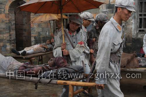 天空下起了淅瀝的小雨,10點(diǎn)左右,隨著金韜導(dǎo)演的“預(yù)備――開始!”的一聲命令,學(xué)生扮演的戰(zhàn)場撤下來的紅軍傷兵,有的躺在紅軍醫(yī)院墻下,有的躺在醫(yī)院門口,有的輕傷員坐在地上;有的傷員由護(hù)士攙扶著、有的由戰(zhàn)士背著、有的擔(dān)架抬著進(jìn)出醫(yī)院。“彭老總”和“毛委員”抬著沉重的腳步緩步走來看望受傷戰(zhàn)士。