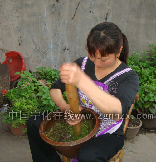 制作擂茶的工具:一是陶制擂缽一個,其口徑約40厘米;二是用樟木或油茶樹于做的擂持(棍)一根。制作擂茶時,首先要考慮季節、時令,確定用哪些青草藥,然后將青草藥切碎,并將其與茶葉、油、鹽等同時放人擂缽中,擂者坐下,雙腿夾住擂缽,手握擂持,頻頻擂搗、旋轉,將擂缽內的東西擂成稀泥狀(寧化稱之為茶泥)。