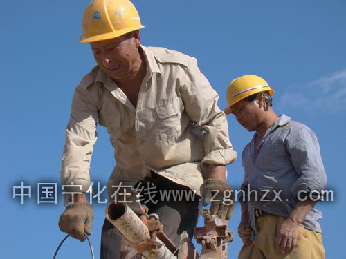 冒著酷熱,工人們?cè)谏衔荻沾髽蚬さ貪仓础?/SPAN>