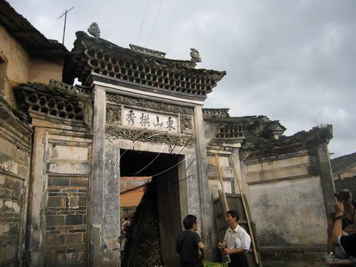 眼前是建筑時間最長的古民居“東山拱秀”。遠遠望去飛檐翹角的門樓,展翅欲飛;端莊遒勁的“東山拱秀”,奪人眼目;斑駁古老的大門,虎虎生威。抬頭近看門楣上精美別致的雕刻藝術令人驚嘆。推門而進,青磚鋪地,河卵石和條石鋪砌成天井,木柱是碩大的杉木,柱礎是雕有各種圖案的六面形石頭,具有堅固防潮作用。無論是梁、柱、拱,在縝密的榫合中給人以渾然天成之感。銜接處密而無縫,沒有一枚鐵釘,毫無松動之感。尤其是梁坊窗戶、門樓門隔上的淺雕、透雕精妙絕倫,無論是飛禽走獸、還是花鳥蟲魚,抑或人物山水,無不栩栩如生,鮮活靈動。其刻工之精細,技法之嫻熟,令人折服。蹀躞于這歷經雨雪風霜500多個春秋的古屋中,一種古樸滄桑之感油然而生。同時,讓人強烈地感受到古屋主人是巨商或是官員,領略到他們曾經輝煌的家族史。