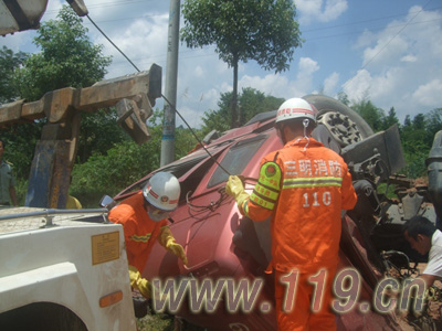 8191135分,寧化原謝坊收費站往清流方向2公里處一輛重型拖車發生交通事故,一名乘員被困。經過官兵近2個多小時的奮力營救,被困人員被成功救出。