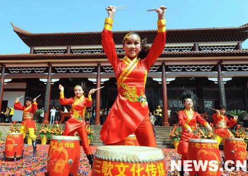 10月16日,演員在第十五屆世界客屬石壁祖地祭祖大典上表演民俗節(jié)目。