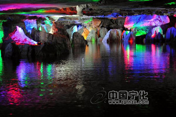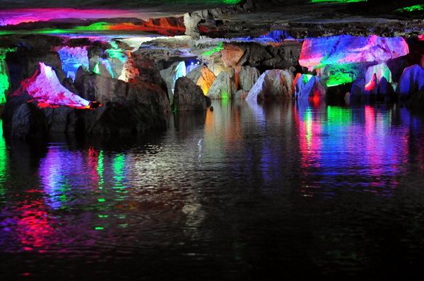 ????在洞內走了一個來小時,眼前忽然明亮起來,原來已經出得洞來了。緊接著,我們又來到了“神風龍宮”。順著潺潺流水聲,我們來到了“龍宮仙河”,坐上小船,緩緩的漂入河道中段,發現整個洞廳寬闊雄渾、飄渺神秘。泛舟河內,寬處如浩瀚西湖,窄處又如蜿蜒曲折、奇險的長江三峽,那佇立于河面上的水中石林,成群成片,規模宏大,造型各異,如鳥似獸,如人似物,千姿百態。船行其間,手可觸摸光滑如玉的石林石芽。抬頭仰望,河穹掛滿鐘乳石,有如漫天繁星;俯首觀水,七彩石林倒映其中,如龍宮仙境。這個被稱為“水下桂林”的圣地果然非同一般。或者,你根本無需抬頭四顧、東張西望地去尋覓景觀,只需靜靜地注視著湖面,便可從湖水的倒影中領略到那層疊恍惚,妙趣橫生的畫面。槳聲、燈影,好一陣我都猶疑我們是泛舟在月夜春江,那“月上東山,風回曲水,江風習習,花草搖曳”之意境似乎就在眼前,真如“江天一色無纖塵,皎皎空中孤月輪”,那種遠離紅塵俗世的超脫情懷,油然而生。