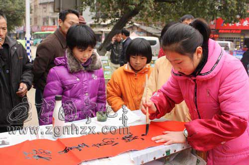 春節臨近,寧化鄉村農民都有貼春聯迎新春的習俗,該縣公安森林分局備好了紅紙和筆墨,邀請寧化書法愛好者陳建智、劉善鷹、羅妍慧等人,突出注意森林防火這一主題,義務為市民書寫春聯。瞧,廣場上,幾張方桌、一沓裁成長條的紅紙,揮灑自如的字體,讓過往的群眾連連叫好,都爭著拿到一幅自己滿意的春聯。
