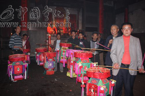 “板凳龍” 又稱“角子燈”,漢花燈中稱“燭橋燈”。是由多塊燈板組合而成的,每塊龍板一般長2米左右,寬25至30厘米不等,板身兩端鑿有一圓孔,供連接榫串用。板身點上蠟燭,數十板與龍頭、龍尾連接,板凳上加以花燈裝飾,便成為“花燈板凳龍”。據說,該村的“角子燈”規模最大時可達150多極,長幾百米,人員多達200余人。
