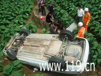 消防官兵到達現場后發現,一輛小轎車四角朝天,墜入農田中,車載人員除一名被困車內,動彈不得,其余均輕傷無生命危險。指揮員觀察情況后立即命令消防官兵迅速展開營救,首先利用破拆器材實施破拆,打開車門,及取出障礙物,后由兩名官兵配合,一里一外,進入車內將被困傷員救出,同時120急救人員負責給被困人員包扎傷口和輸液,確保傷員生命安全。