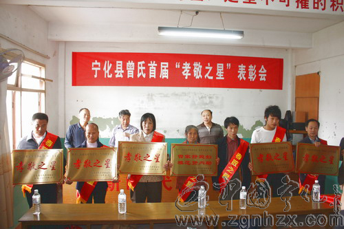 2009年3月。為了在廣大宗親中倡導尊老敬老,家庭和睦這一良好風尚,曾氏宗親特別設立了這一評選活動。去年底,理事會就把推薦表格頒發到各分會,由各分會提出在村里最符合條件、最優秀的人選上報理事會,理事會和監事會派出專人到被推薦人選的村進行廣泛的民間調查,聽取各方面意見和建議,以確保評選質量。表彰會上,主持人曾仁新宣讀了7位“孝敬之星”“曾家好媳婦”的感人故事。這七位分別是:悉心照料九旬母親的治平鄉光亮村曾欽東,視公婆為親生父母的曹坊曾家背曾家好兒媳——周細香、鄧根妹、劉紅秀三妯娌,精心照顧癱瘓父親的濟村鄉吾家湖曾顯煌,水茜鄉沿口村大孝子曾時浪,照顧癱瘓丈夫30年的方田南城村羅仙女,與父母相敬如賓的方田王屋坑曾紹恩、丁玉才夫婦,對公爹關懷備至的曹坊鄉曾家背村方鳳根。