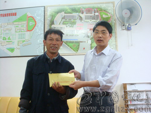 校方負責人把募捐款轉交給游小華父親,老人感動得熱淚盈眶