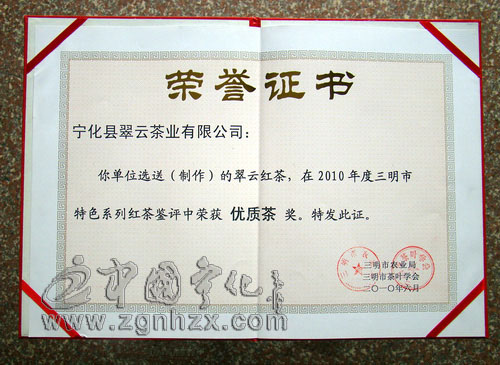 昨日,寧化縣翠云茶業有限公司制作的翠云紅茶在2010年度三明市特色系列紅茶鑒評中榮獲優質茶獎,這是該公司繼第五屆海峽兩岸(三明)林業博覽會暨三明市第四屆茶文化活動名優茶鑒評活動中獲得“本山”茶一等獎、“鐵觀音”茶銀獎之后的又一個殊榮。