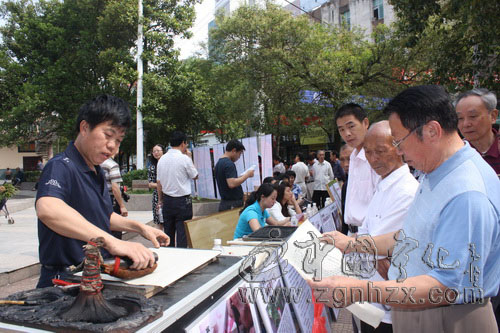 在一旁的非物質(zhì)文化遺產(chǎn)保護(hù)成果展覽現(xiàn)場,一幅幅精心制作的展板,詳細(xì)描述了石壁客家祭祖習(xí)俗、客家擂茶、客家山歌、夏坊游儺、石壁祭祖大典、寧化祁劇、牌子鑼鼓、治平玉扣紙、寧化淮土高棚燈、老鼠干制作工藝等國家級、省級、市級“非遺”保護(hù)項目,充分展示了近年來寧化在非物質(zhì)文化遺產(chǎn)保護(hù)方面取得的喜人成果。精美的圖片、風(fēng)趣的內(nèi)容吸引了很多市民前來參觀。工作人員還向現(xiàn)場群眾發(fā)放了《保護(hù)文化遺產(chǎn),弘揚客家精神》、《福建省文物保護(hù)管理條例》等宣傳單2000余份。