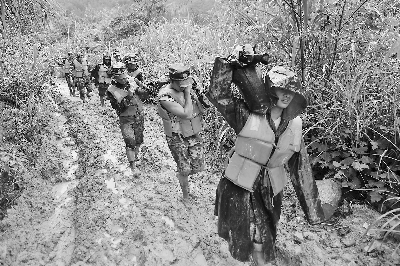 ← 25日,南平市延平區(qū)南山鎮(zhèn)店口電站水庫,省武警總隊官兵踩著新挖掘出來的泥路,用肩扛手抬的方式翻山越嶺運送發(fā)電機(jī)、水泵等數(shù)噸排險物資。 本報記者張永定 方煒杭 攝?