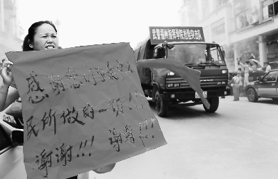 ↑ 28日,一名市民向一輛輛緩緩駛出的軍車舉起感謝橫幅。當(dāng)日,泰寧縣1萬多名干部群眾熱情歡送首批450名撤離的武警官兵。林輝 邱燦旺 攝?