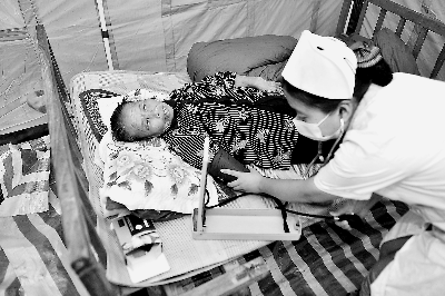 ↑ 27日,建陽市將口鎮(zhèn)芹口村受災(zāi)群眾安置點,建陽市黨員醫(yī)療突擊隊的醫(yī)護(hù)人員在救災(zāi)帳篷里給高血壓患者張進(jìn)娣檢測血壓。張永定方煒杭 攝