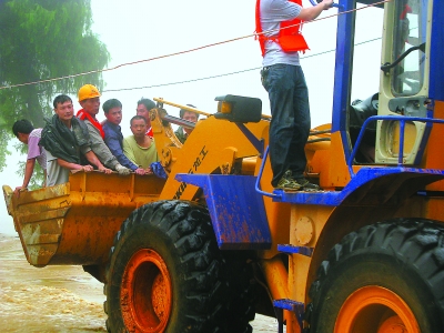 18日,被困清流嵩口“孤島”的施工人員乘大型鏟車成功撤離。本報記者鄭長輝 攝