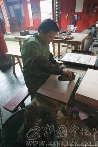 玉扣紙壓在刷上墨水的版面,用棕毛團(tuán)拍打,印刷便完成了。
