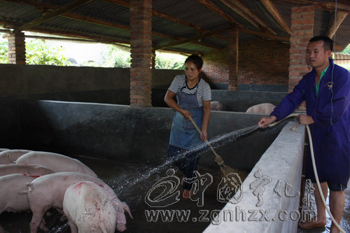 一天4-5此沖洗豬圈,每天5點起來,割兩挑青草給豬吃,8點鏟豬糞、消毒,9點開始喂豬,10點給每條豬體檢,中午1點給豬沖涼……盡管每天都干得很辛苦,但他們累并快樂著。